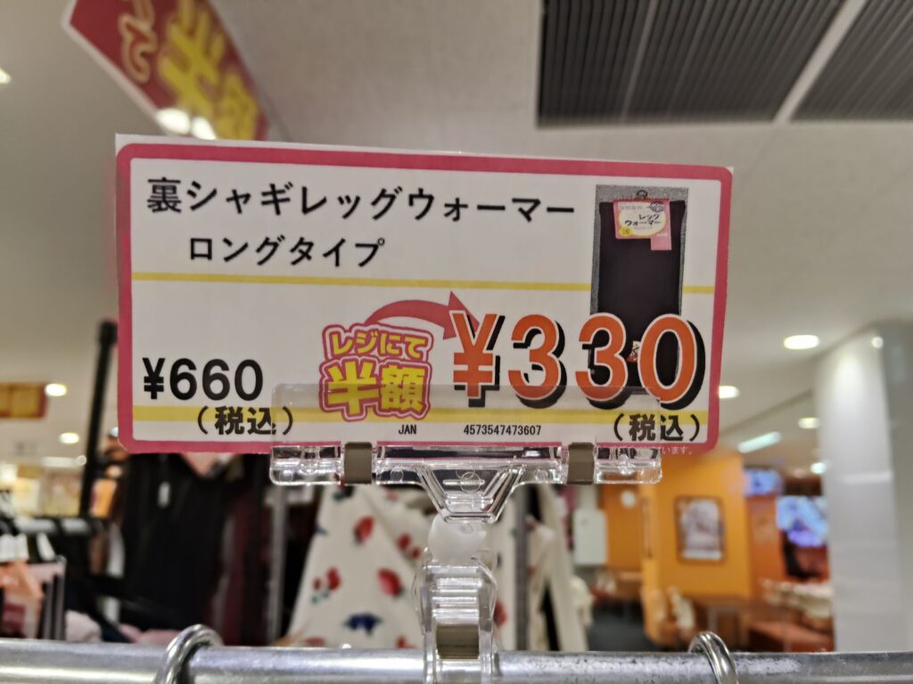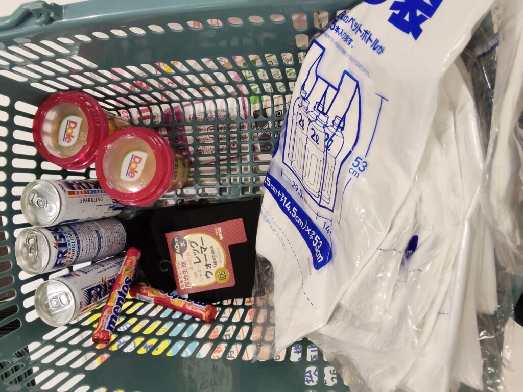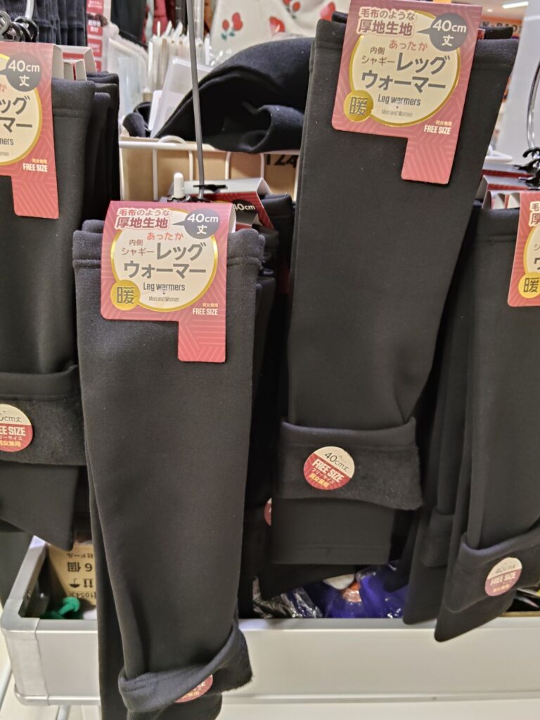 お試しに安いお菓子とドリンク、レッグウォーマーとビニール袋を買いました。