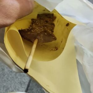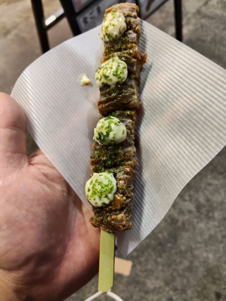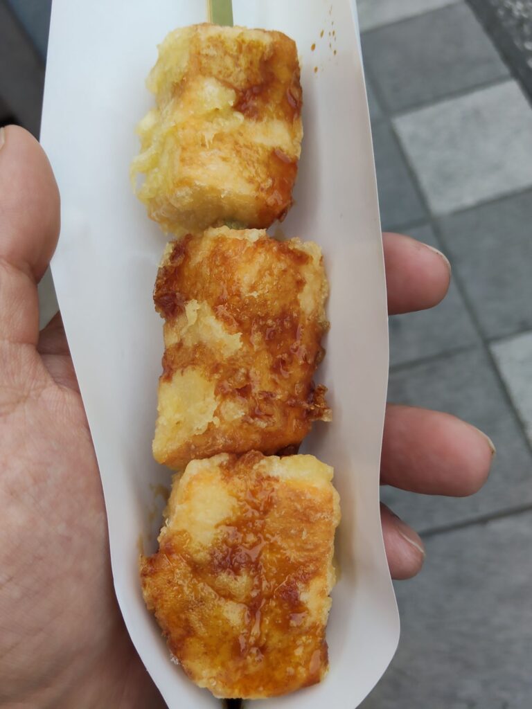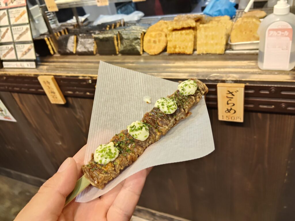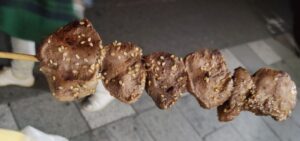 肉の串焼きみたいな見た目ですが、中がしっとり、外が固めの濡れたアラレせんべいの食感です。