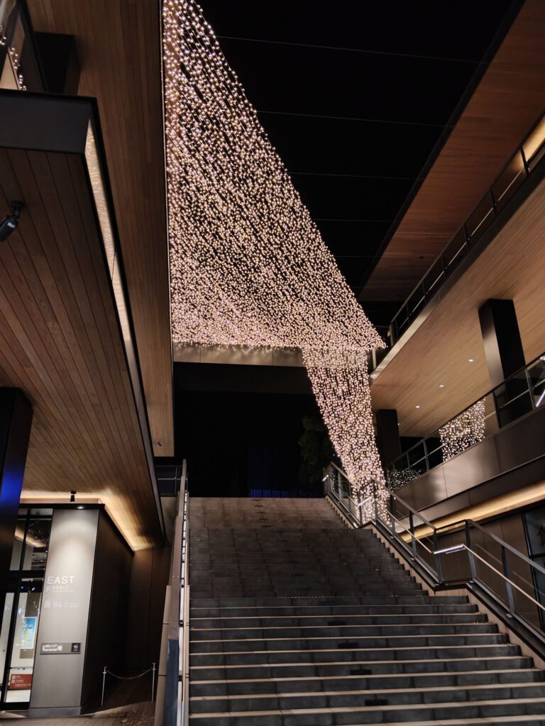 GREEN SPRINGSの隠れた名スポット、「スカイデッキ」。 光で彩られた階段と、すぐ横を流れる水のせせらぎ…、上るだけでテンションが上がります。