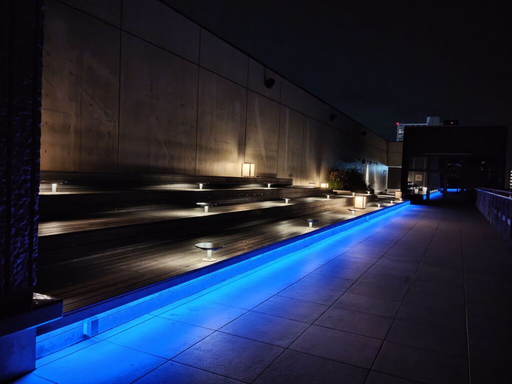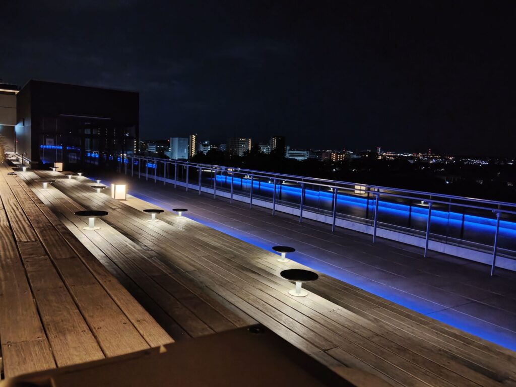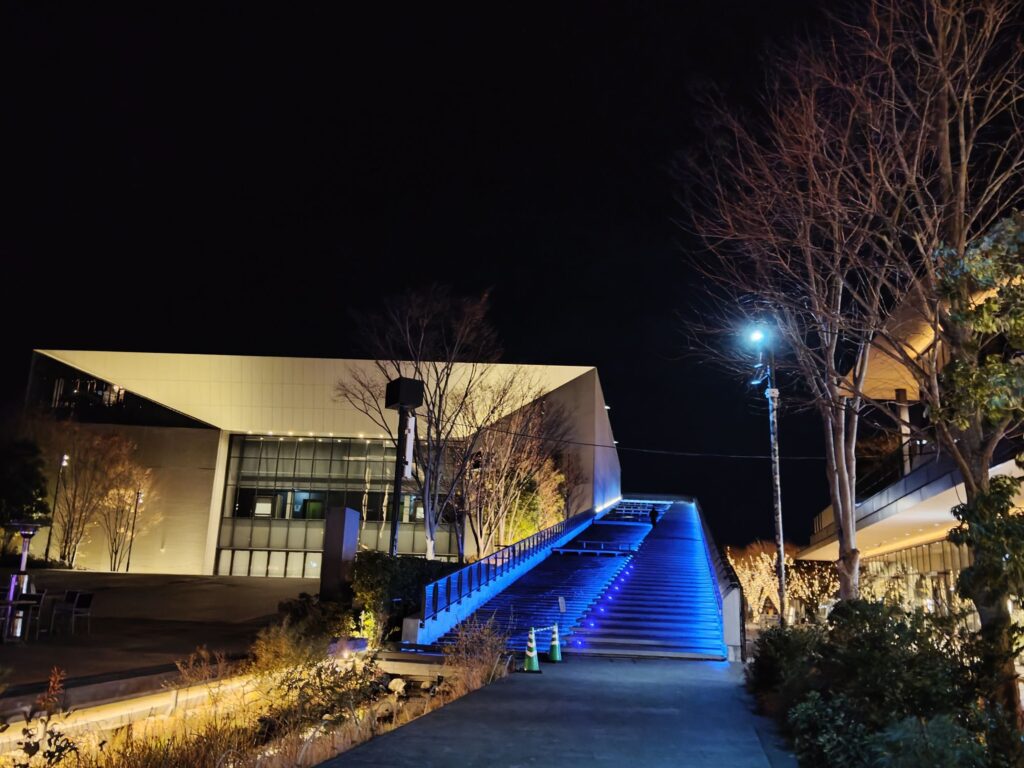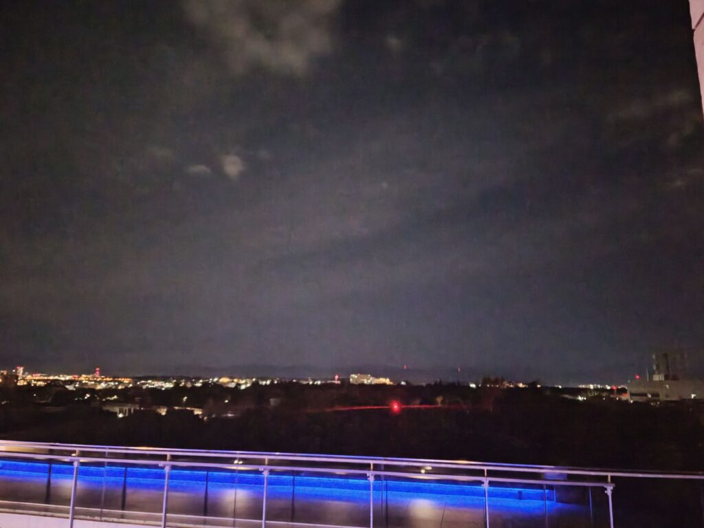 登り切り、昭和記念公園側の通路を進むと、 闇夜をライトで彩られた無料の「スカイデッキ」があります。
