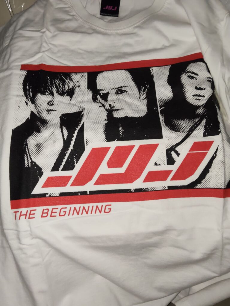 JYJ「THE BEGINNING」関連の公式/限定Tシャツ(おそらくCD特典やグッズ)は、基本的にユニセックスフリーサイズで展開されているケースが多く、M/Lのような通常のS/M/L表記は付いていないことがほとんどです。